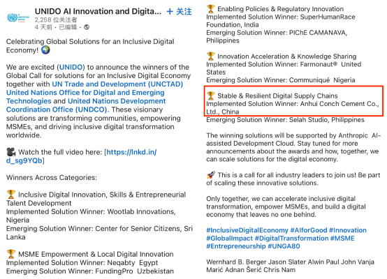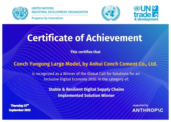 近日,海螺集團(tuán)下屬“安徽海螺水泥股份有限公司——海螺云工大模型”在聯(lián)合國工業(yè)發(fā)展組織等機構(gòu)于2025年7月發(fā)起的“2025包容性數(shù)字經(jīng)濟全球解決方案征集”中,榮獲: 穩(wěn)定與韌性的數(shù)字供應(yīng)鏈 類別 最佳實施方案獎 獎項。