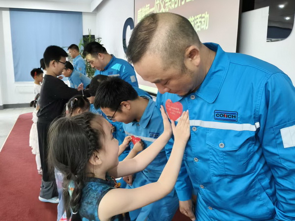 工廠還為每位爸爸準(zhǔn)備了“職場父親愛心勛章”,由孩子們親手為爸爸佩戴。制造分廠一名員工在收獲女兒的勛章以及親吻時,頓時紅了眼眶,勛章上的暖心話語-“爸爸,您是全家的支柱,有您才有家,一定要注意安全,讓我們安心”,就是女兒沒有說出來的期盼。
