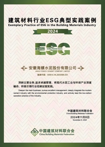 111314日,中國建筑材料聯(lián)合會在北京召開2024年度建筑材料行業(yè)大會,會上發(fā)布了中國建筑材料行業(yè)ESG發(fā)展研究報告(2024)及典型案例,海螺水泥憑借在ESG方面的卓越實踐,成功入選“2024年度建筑材料行業(yè)ESG典型實踐案例。