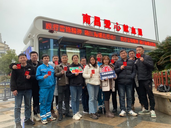南昌市獻(xiàn)血屋前,贛江海螺的14名青年志愿者們完成無償獻(xiàn)血后,在蒙蒙細(xì)雨中留下“愛心合影”。