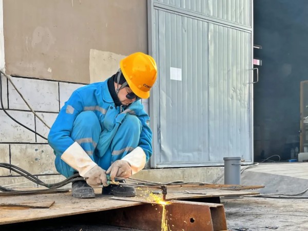 卡爾希海螺維修工貝克正在進行鋼材下料作業(yè),他說:“Payvandchi qo‘lidagi yong‘in – uskunaning barqaror ishlashining kafolati.(用我手中的焊槍,保障設(shè)備穩(wěn)定運行)